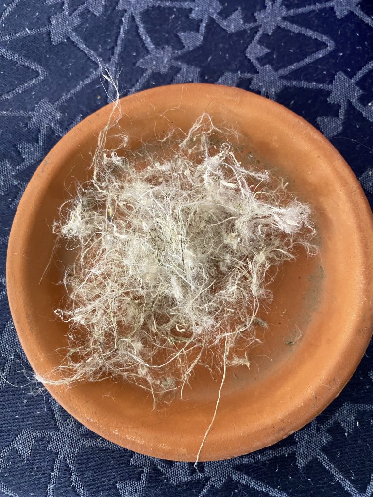 We didn’t have proper carding tools but made use of a hairbrush and a comb, I believe. The main idea with carding is to get the fibers all in the same direction.