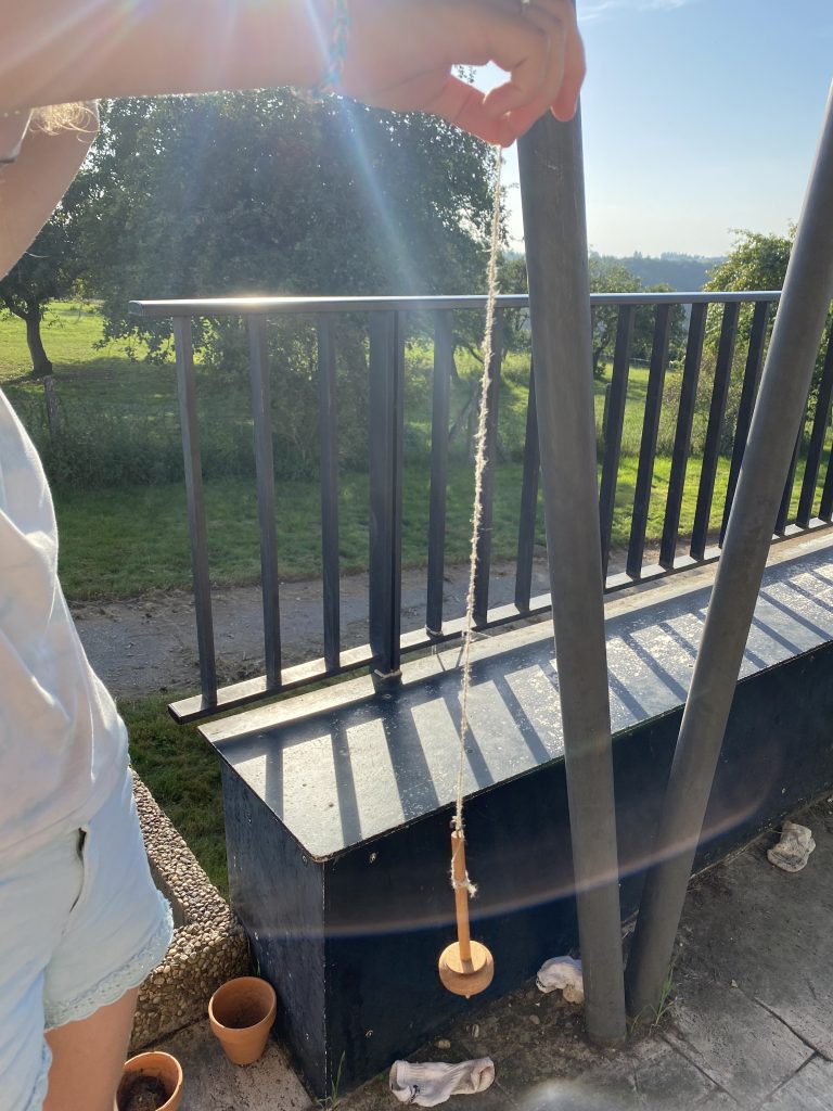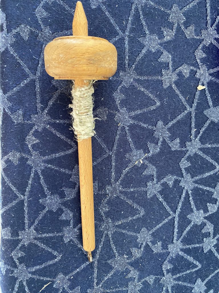 We have a drop spindle bought at a medieval market, so it’s something very similar to what Maeryn would have used to turn that fluff into yarn. You hold a bit of fluff to the spindle, drop it and set it spinning, and gradually pull in more fiber as it keeps spinning so that it spins it into a long strand of yarn.